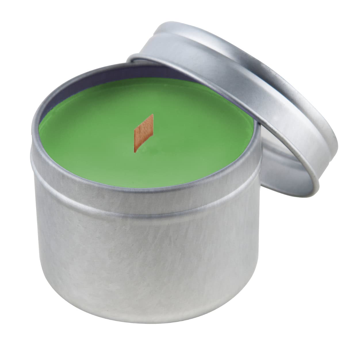 Handgemachte Duftkerze aus Bio-Kokoswachs in dekorativer Weißblechdose.