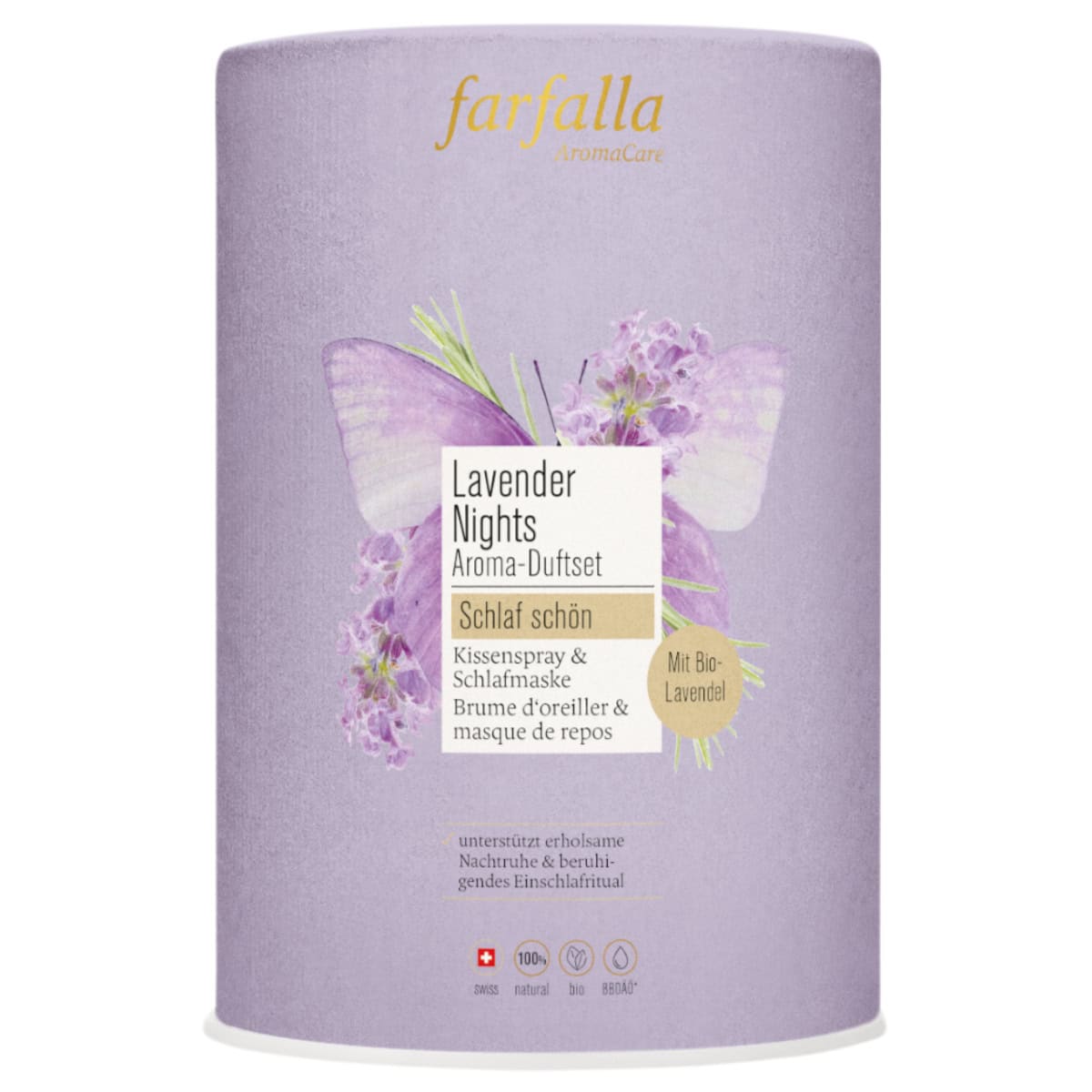 Inhalt: Schlafmaske aus Baumwolle gefüllt mit Lavendelblüten und Leinsamen sowie das Farfalla Gute Nacht Kissenspray 30 ml
